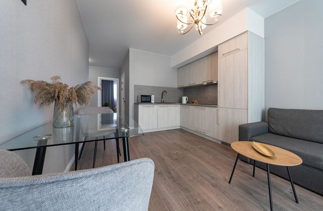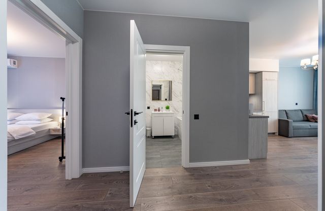 Сучасна квартира з окремою спальнею та з балконом, загальною площею 55 кв м, розміщена в новому житловому комплексі Лебединий, Дарницький район, мікрорайон Позняки, станція метро Харківська - 2 хвилини пішки.