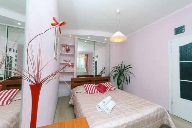 Квартира предназначена для комфортного пребывания шести человек, спальные места: 2+2+2. В каждой спальне есть двуспальная кровать с ортопедическим матрасом, комод с зеркалом, шкаф-купе. Во второй спальне есть также прикроватные тумбы. В гостиной есть раскладной диван, кресло, журнальный столик, кабельное ТВ, Wi-Fi. На кухне имеется вся бытовая техника и посуда. В ванной комнате: сантехника, стиральная машина, фен, полотенца. Возможна организация трансфера и предоставление отчётных документов.