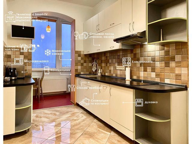 + Простора кухня в якій можна приготувати найсмачніші сніданки та насолоджуватися ними за столиком на балконі, споглядаючи як просинається Київ