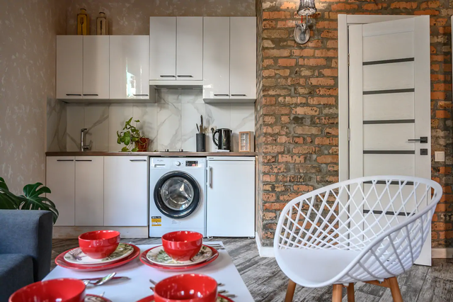 Повністю облаштована кухня: плита, чайник, холодильник, посуд, пральна машина